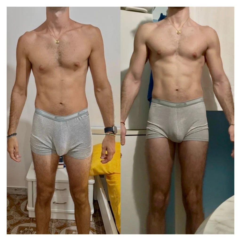 Petto poco pieno, spalle piatte, addome morbido. Aumenti le calorie, poi le tagli. Cambi scheda e poi riparti da zero..